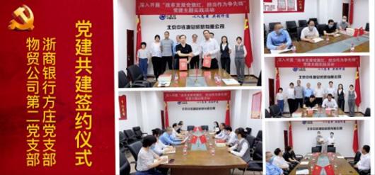 第二党支部与浙商银行方庄党支部组织开展党建共建主题活动。共建双方围绕“加强党建引领、服务经济建设,创新发展模式、实现银企共赢”为主题,举行了党建共建签约仪式。物贸公司党委书记冯明照、总会计师马金才出席并讲话,双方代表签署了银企党建共建协议,互赠党建学习资料,并就今后如何利用党建共建平台,做好组织共建、党员干部共建、业务共建等各项工作,开展深入探讨与交流。共建双方一致认为,要围绕中心、服务大局,切实发挥双方党组织的政治优势,克服疫情带来的不利影响,创新载体、资源共享,搭建银企合作桥梁,探索出一条中央企业与股份制银行党组织结对共建、实现双赢的改革创新之路,促进物贸公司党建工作深度融入经营管理和业务工作。