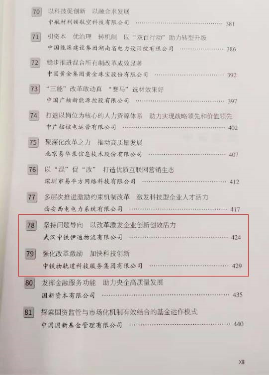 2020年10月,由国务院 改革办、国务院 新闻中心编著的国资国企改革经验案例丛书《改革样本——国企改革“双百行动”案例集》正式出版发行。中国铁物“双百企业”轨道集团《强化改革激励 加快科技创新》和中铁伊通公司《坚持问题导向 以改革激发企业创新创效活力》案例成功入选案例集。