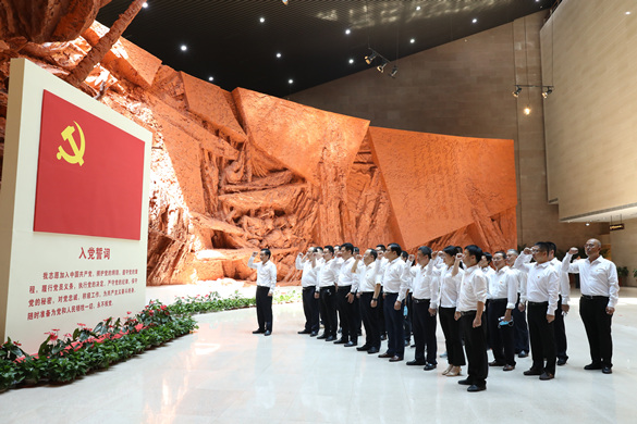 在纪念馆一楼大厅,面对鲜红的党旗,全体受奖人员高举右手,重温入党誓词,进一步增强党员的党性观念,激励党员牢记党的宗旨,履行党员义务,做一名合格党员。