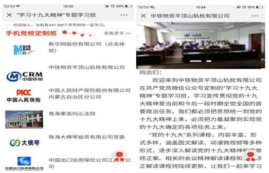 为贯彻落实《关于做好有关中央企业与 直属机关领导干部学习贯彻党的十九大精神集中轮训工作的通知》有关精神和工业集团《关于进一步认真做好开展习近平新时代中国特色社会主义思想和党的十九大精神学习培训工作的通知》要求,平轨公司党委召开专题会议研究部署学习方案,在确定充分利用党员职工工作之余的碎片时间进行系统学习这一思路后,公司党委决定组织公司党员参加由新华网手机党校开办的“学习贯彻党的十九大精神”专题学习班。该机构以中组部党员教育中心主办的“共产党员”微信公众号为平台,以创新党员教育培训的“互联网+”新模式为载体,为党员群体提供在线教育、学习、培训课程服务。经协商,该机构为平轨公司定制专门入口的专题学习班,将平轨公司的党员纳入单独入口的学习班。学习班分学、练、赛3个阶段,学:组织“学习贯彻党的十九大精神”主题学习班进行学习;练:学习班学习过程,提供练习题,并附答题解析,通过练习巩固所学知识;赛:完成相应课程后,在线参与答题竞赛,每个学员学习、练、赛均会记录相关数据。